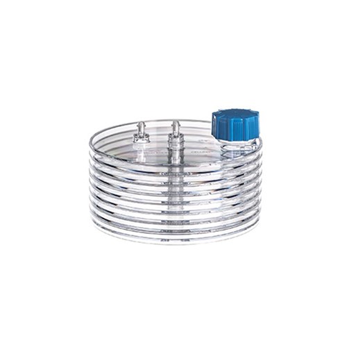 Celldisc™ multilayer device, physical surface treatment, ventilation through central gas support channel, gas inlet and outlet equipped with filters, blue screw cap, 16 layers, 4000 cm².