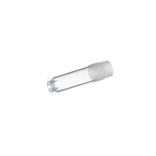 Cryo.s™ with natural screw cap, external thread, round bottom, starfoot base and additional cap inserts for labelling.