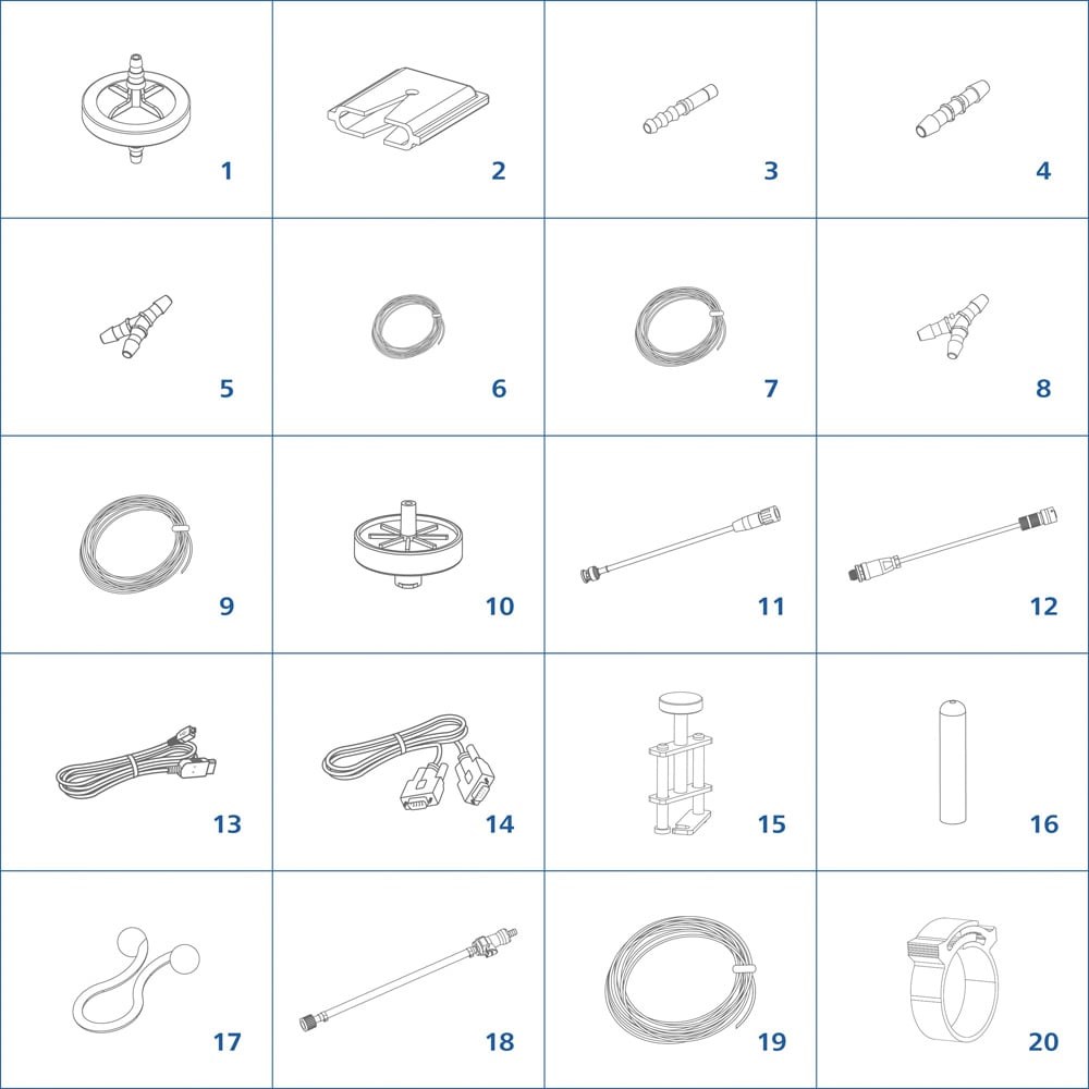 Cable and tube set for double-wall bioreactor glass vessels. It includes filter and tubing for liquid supply (3.2mm BPT tubing and 4.8 & 8mm silicone tubing), filter heater, connectors, cables for pH and DO sensors, USB and RS232 cables, silicone caps, tubing clamps, tubing with GL18 and quick connector, and 8 mm silicone tubing.
