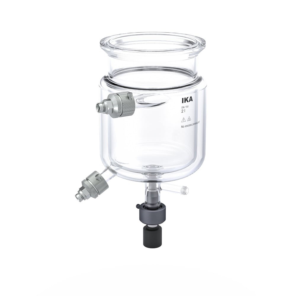 Double-walled reactor vessel with bottom discharge including accessories for the EasySyn reactor system.