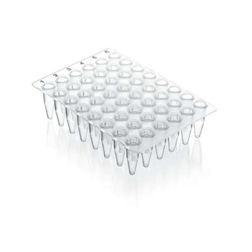 PP. 0.2 ml wells. These plates reduce material costs and allow work on a compact PCR plate even with small sample throughputs. The ultra thin-walled PCR plate design facilitates constant, rapid and precise heat transfer. The smooth vessel interior minimizes the binding of enzymes and nucleic acid to the walls. The raised lips of the wells protect against cross-contamination, allowing a reliable seal with the sealing mat tailored to the plates.