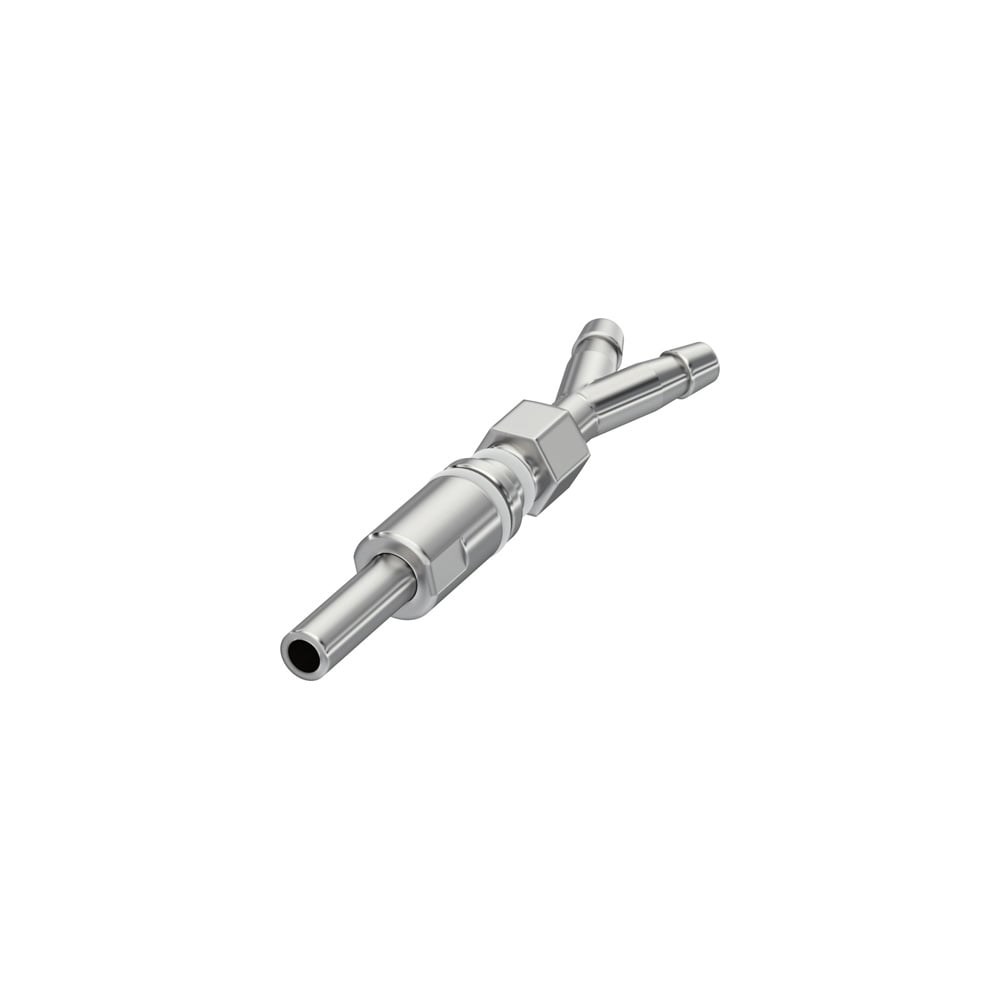 Port with two inlets for liquid supply. Through a hose connection to the peristaltic pumps integrated on the tower, liquids (e.g., nutrient solutions) can be fed into the bioreactor vessel.