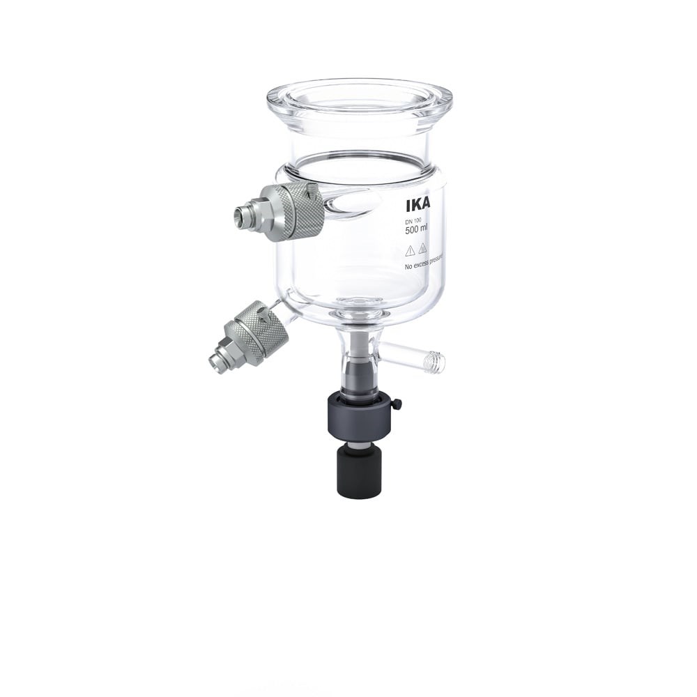 Double-walled reactor vessel with bottom discharge including accessories for the EasySyn reactor system.